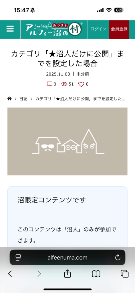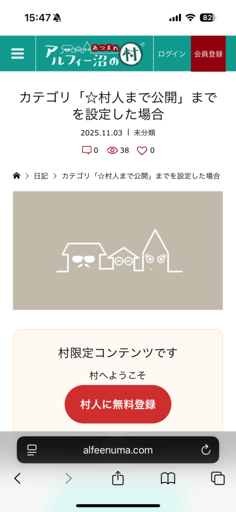 下のように本文部分が隠れ、代わりに「村 / 沼限定コンテンツです」と表示されます。