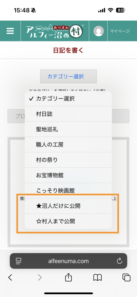 日誌のカテゴリを 村人まで / 沼人だけ に変更できます。