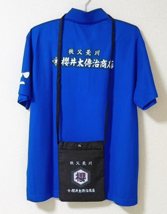 太伝治商店のポロシャツ着てサコッシュも身につけてるとお店のお使いで来たバイトみたい。