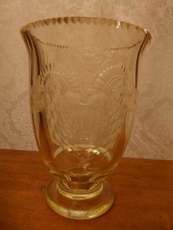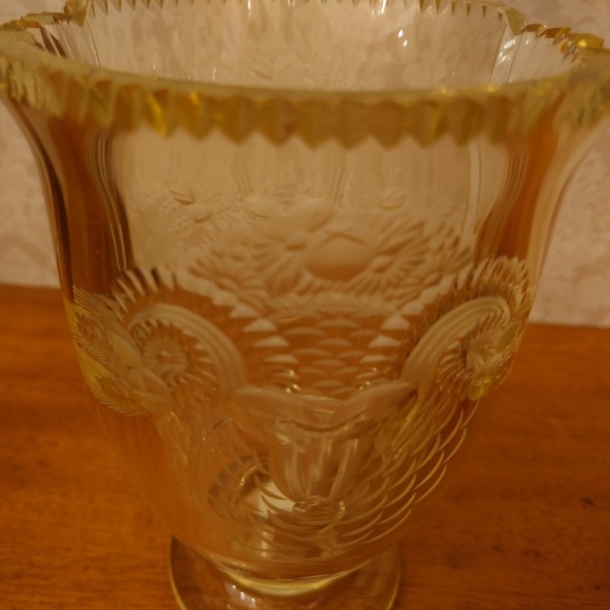 ウランガラスらしいこの黄緑がブラックライトがあたると、凄く光ります!彫りは植物なのですが、全体像が羊っぽかったりして面白いお品です。使わない時は、飾り棚の一番下に場所を決め、せっかくなので似合いそうと見繕ったお花を早速活けました♡