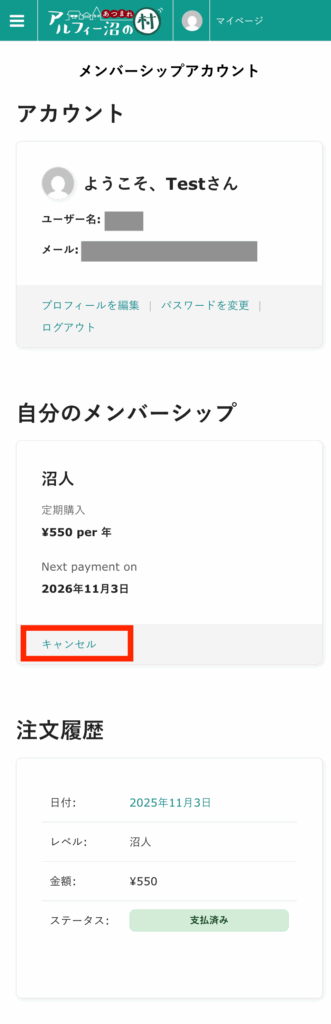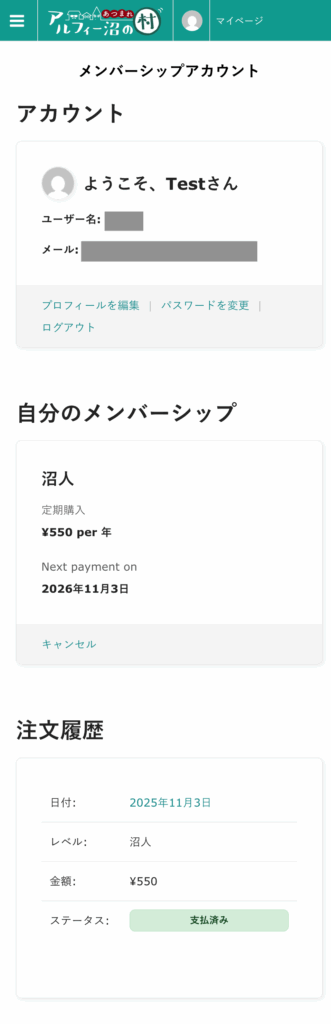 ↓下記のように「自分のメンバーシップ」欄に「沼人」と表示されている場合は、すでに会員になっていて、特典が適用済みです。お支払い履歴や有効期限も確認できます。