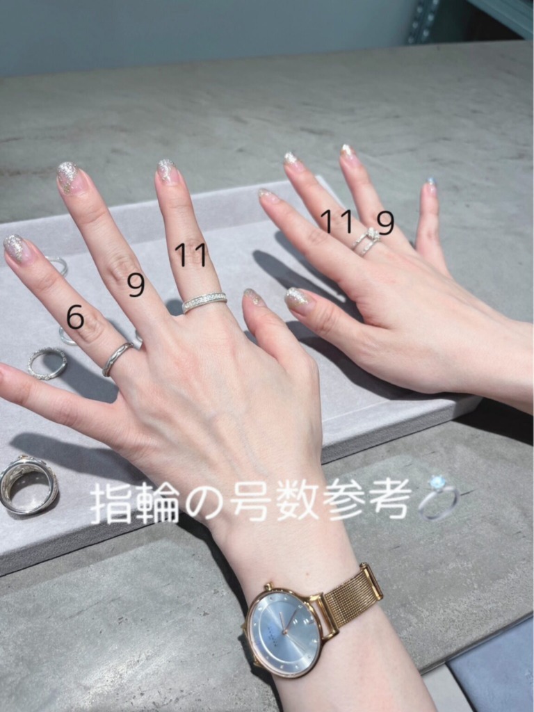 左手薬指のサイズしか知らなかったので、中指7号いけると思ってましたが、いけませんね(笑)しかも右は左よりひと周り大きい。お店に来てよかった。ちゃんと測るの大事です。薬指しか知らないって人多いと思うんですよね。