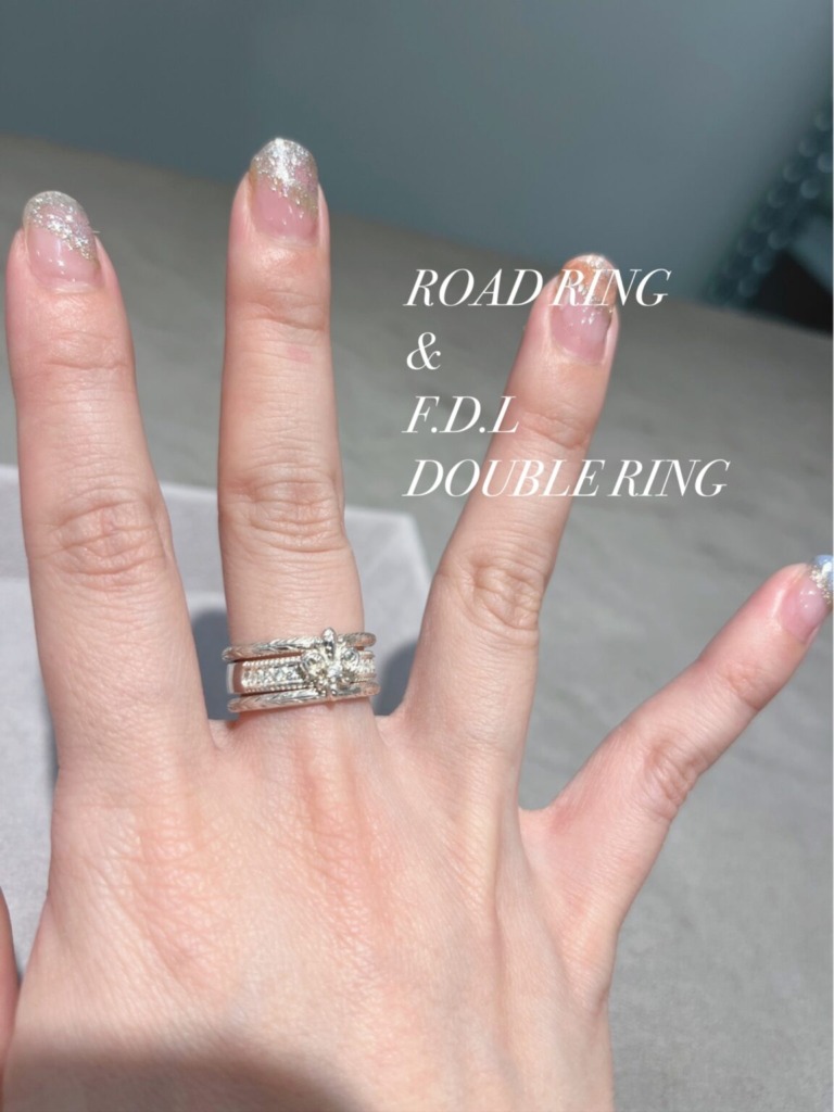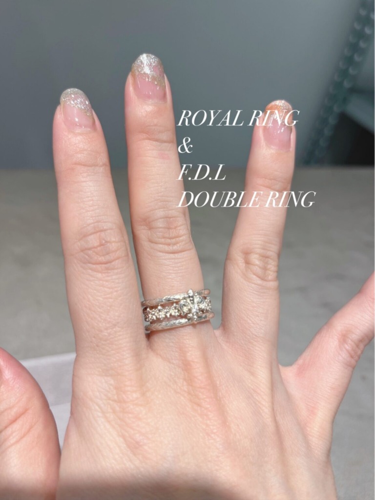 こちらはダブルリングとロイヤルリングの組み合わせ。ロイヤルリングの華奢みが隙間を作ってくれて、女性らしい感じになりますね。