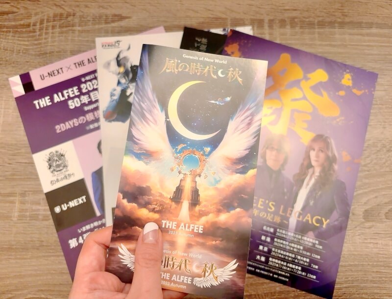 私が絶対持って行くのがクリアファイル。アルフィーのライブではメモリアルチケットがもらえます。あと、近日公開イベントなどのフライヤーが入ったリーフレットセットも配られます。